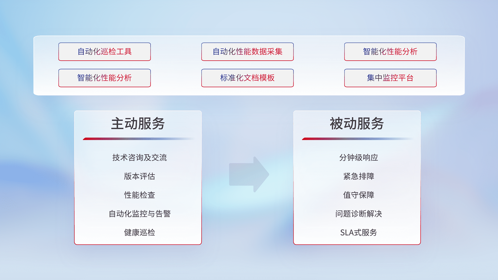 智能化工具和标准化文档,,,,保障服务质量,,,,提供主动服务(包含技术咨询、、、、版本评估、、、、性能检查、、、自动化监控与告警、、健康巡检)和被动服务包含(分钟级响应、、紧急排障、、、、值守保障、、、问题诊断解决、、、SLA服务)。。。